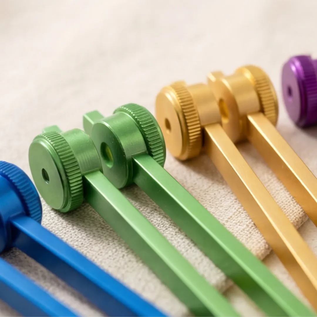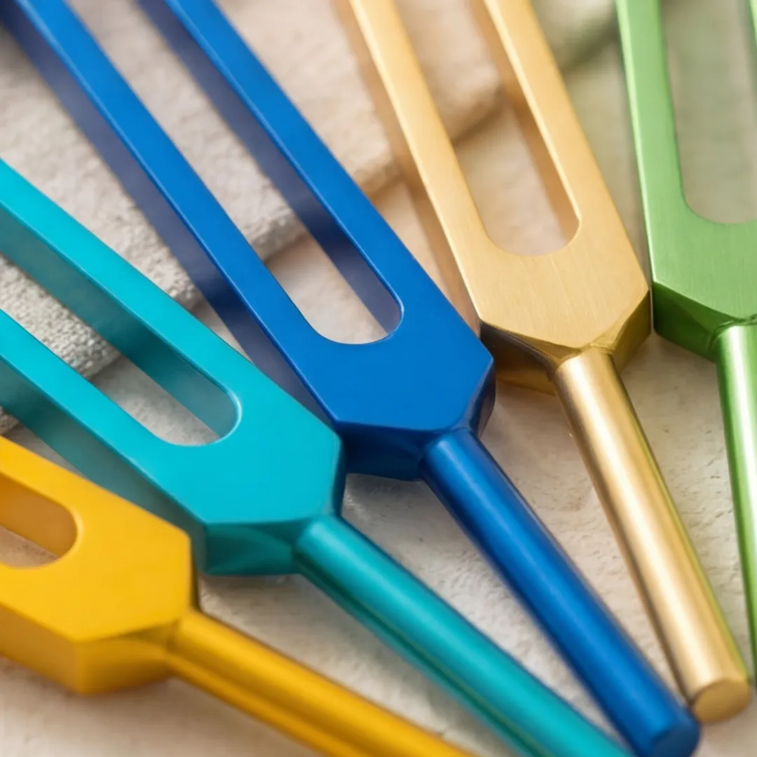 This set of 8 aluminum alloy tuning forks is designed with weighted ends to deliver a deeper, more tactile vibration. Weighted forks are ideal for placing on or near the body — helping with energetic awareness, grounding, and relaxation during sound healing or somatic practice.